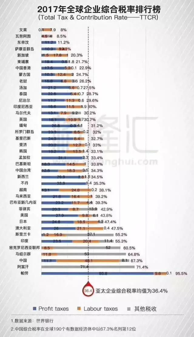 在世界銀行的定義中,總稅率是用企業(yè)減免掉法律允許部分之后必須繳納的稅額占商業(yè)利潤的比例,包括利潤稅或企業(yè)所得稅、雇主繳納的社會派款和勞務(wù)稅(包括所有強制性派款,甚至包括交付給返還型養(yǎng)老金之類的私營實體的派款)、財產(chǎn)稅、周轉(zhuǎn)稅和其它稅(如市政設(shè)施費以及車輛稅)等五類。