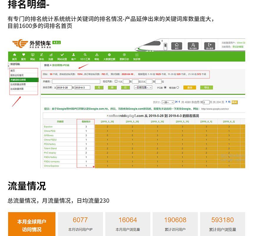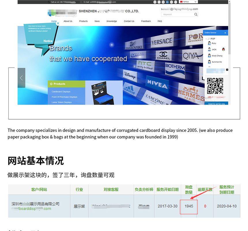 該公司是一家專業(yè)設(shè)計(jì)和制作各類紙貨架,紙貨架、紙展示架、獨(dú)立牌、包裝彩盒、促銷彩盒、促銷堆頭等POP展示用品公司,產(chǎn)品直銷國(guó)內(nèi)和歐洲、北美、東南亞等地區(qū)。終端展示類紙制品以其環(huán)保低耗、成本價(jià)廉、絢麗多姿、裝運(yùn)輕便,使用方便,促銷效果顯著等優(yōu)點(diǎn)在國(guó)外發(fā)達(dá)地區(qū)已發(fā)展為主要的終端展示用制品,國(guó)內(nèi)市場(chǎng)中該類制品業(yè)正逐步被各大中型日用品,冷飲和服裝品牌企業(yè)股份使用!一次性簽約外貿(mào)快車3年服務(wù),共計(jì)拓展了4000多個(gè)產(chǎn)品相關(guān)關(guān)鍵詞,目前已有1600多個(gè)關(guān)鍵詞排名在谷歌首頁(yè),這些關(guān)鍵詞每天可為該網(wǎng)站帶來(lái)200多個(gè)流量,客戶共計(jì)收到近2000個(gè)詢盤。