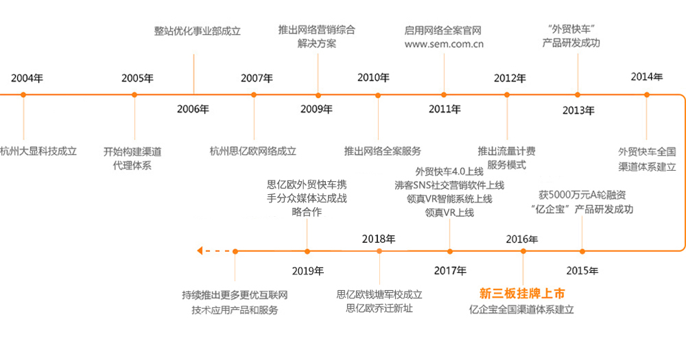 公司于2006年成立了面向國內外主流搜索引擎的整站優化事業部,于2009年推出了網絡營銷綜合解決方案,2010年推出了互聯網營銷“網絡全案”服務,2011年創立了搜索流量計費服務模式。公司于2013年底成功研發了針對外貿企業的網絡營銷產品外貿快車,并于2014年初推向市場,2015年建成全國渠道體系。2015年8月,杭州思億歐網絡科技股份有限公司旗下子公司大顯科技隆重推出面向國內中小內貿企業網絡營銷綜合解決方案產品億企寶,2021年7月推出抖音視頻推廣優化系統,2022年7月正式上線億視推抖音短視頻推廣系統。